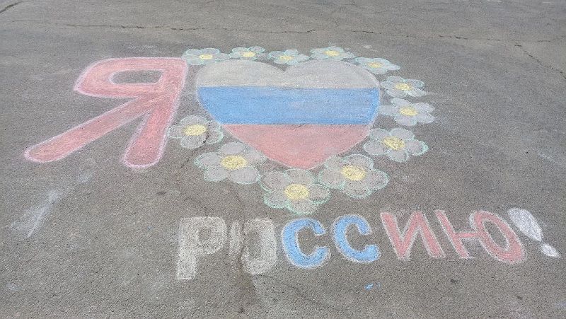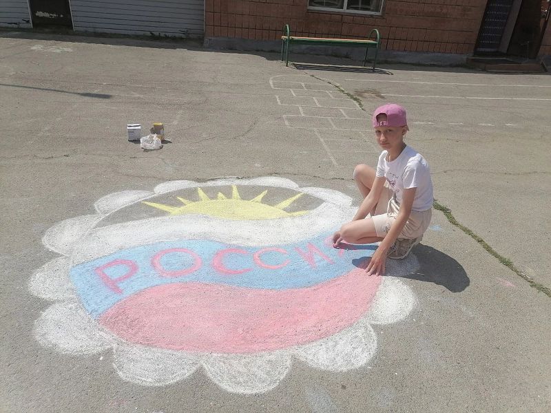 Поле квеста, каждый отряд изобразил на асфальте в школьном дворе открытку ко Дню России.