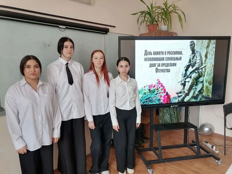 13 февраля, в День памяти о россиянах, исполнявших служебный долг за пределами Отечества, в 9а классе пошел тематический классный час. Этот важный день напоминает нам о героизме наших соотечественников, выполнявших миротворческие миссии и оказавших помощь другим странам в трудные времена.