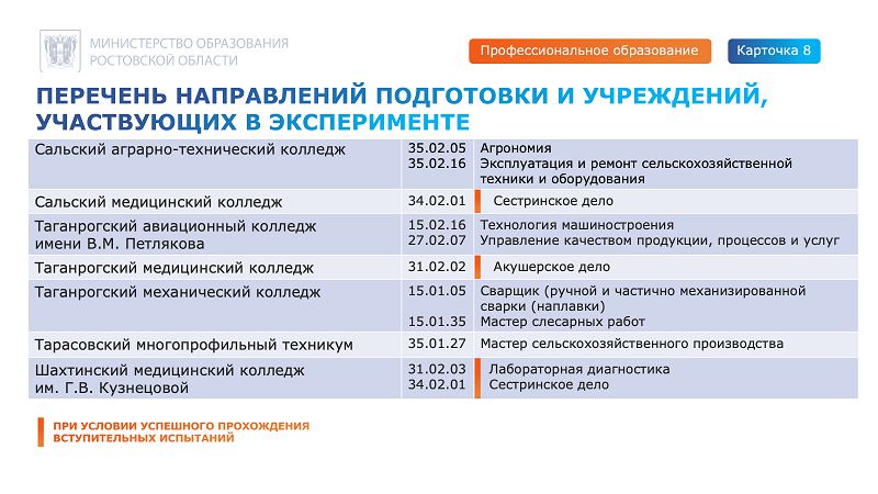 Однако проект направлен на профессиональное ориентирование и быстрое получение востребованных в регионе профессий. В связи с этим поступление по упрощенной системе возможно только на конкретные направления в колледжи, участвующие в проекте.