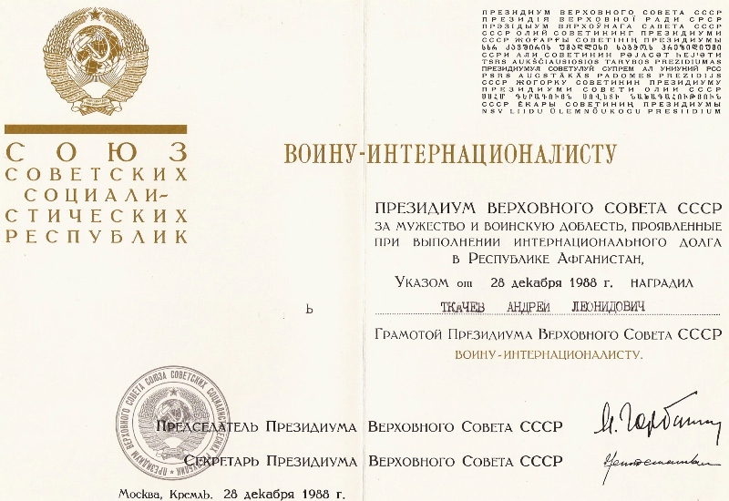 Президиум Верховного Совета СССР за мужество и воинскую доблесть, проявленные при выполнении интернационального долга в Республике Афганистан, Указом от 28 декабря 1988 г. наградил Ткачева Андрея Леонидовича Грамотой Президиума Верховного Совета СССР и медалью «Воину – интернационалисту»,