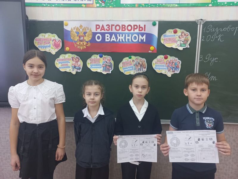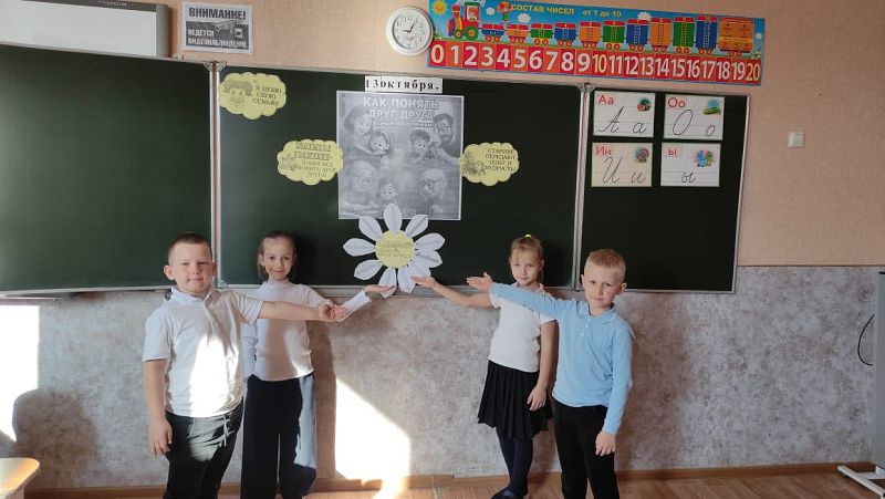 В начальной школе, 1–4 классы, поговорили о том, что такое семья и что объединяет всех членов семьи. Учащимся предложили рассказать о своих близких: с кем они любят проводить время, какие темы обсуждают, на кого больше всего похожи или хотели бы быть похожими, какие традиции есть в их семье. В продолжение урока школьники посмотрели фрагмент мультфильма «Трое из Простоквашино» и подумали, из-за чего происходили ссоры в семействе главного героя мультфильма — Дяди Федора — и что можно было бы посоветовать его родителям.