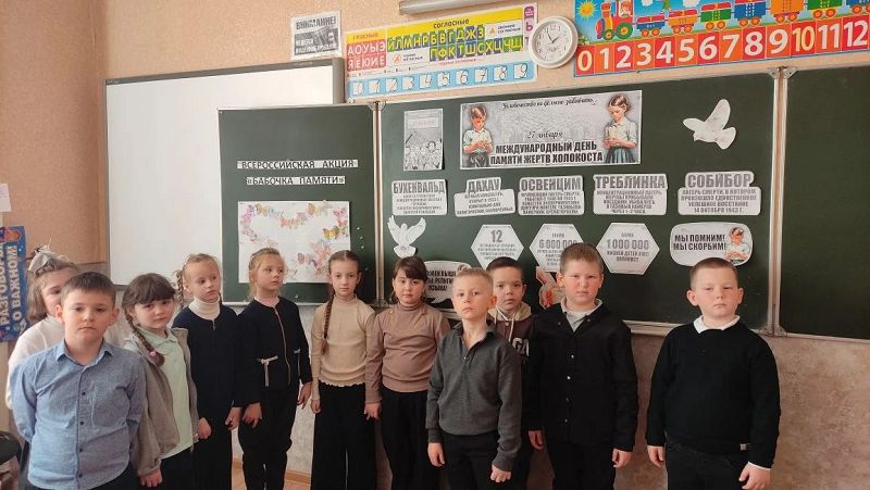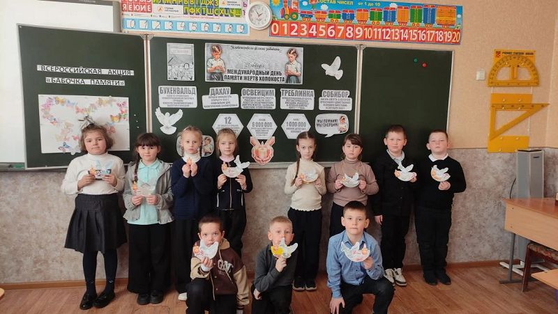 В1а классе прошел классный час, посвященный Международному дню памяти жертв Холокоста. В память о погибших в концентрационных лагерях детях и против повторения трагедии Холокоста, ребята приготовили разноцветные красивые бабочки и собрали их в единый коллаж в форме большой бабочки.